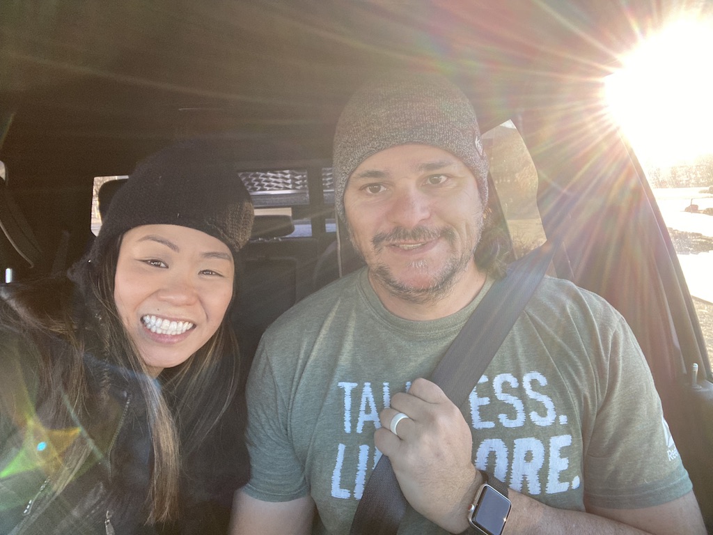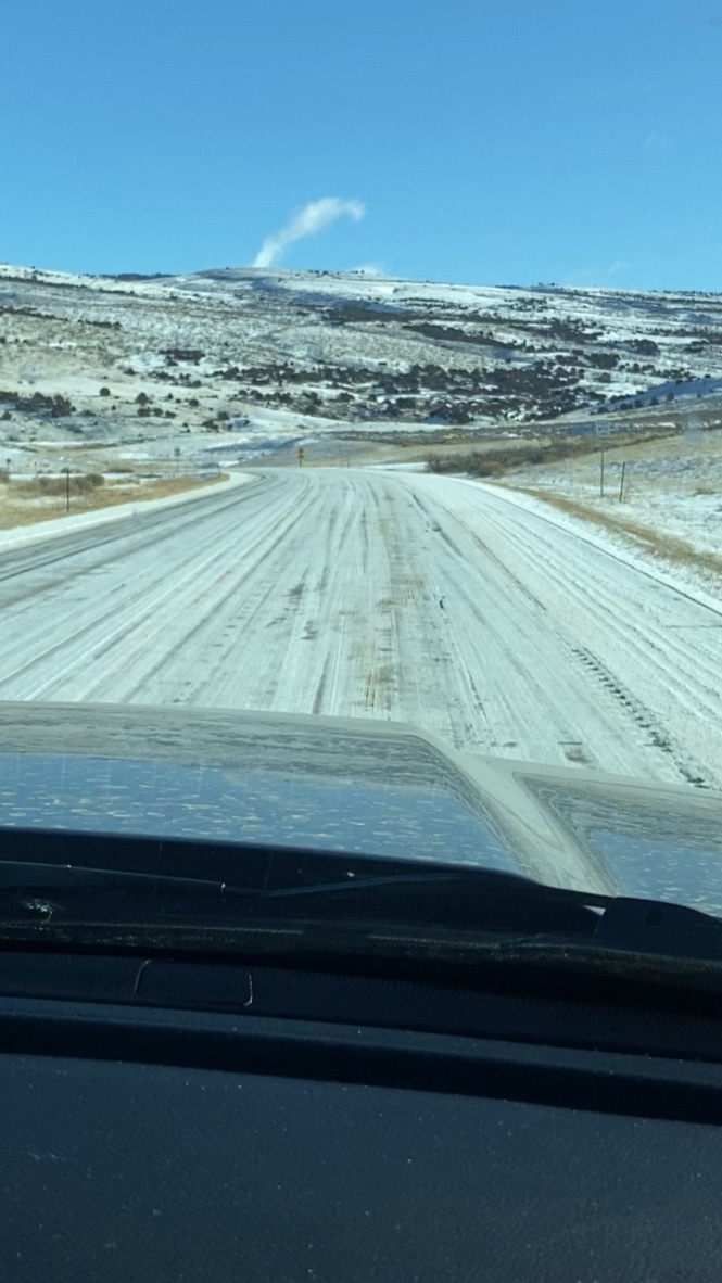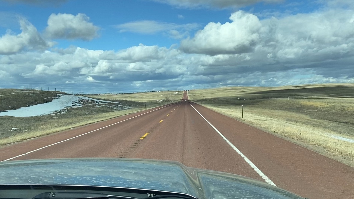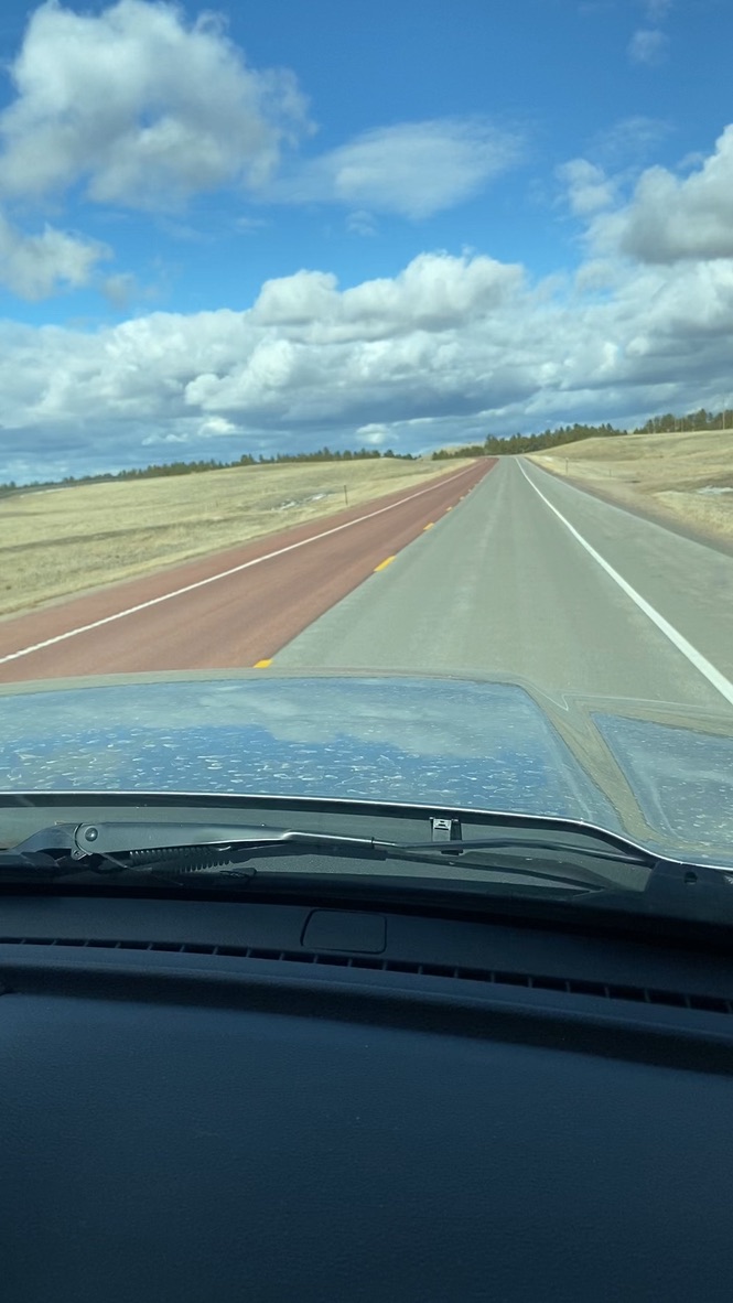 The following day, Mike drove us the rest of the way from Wyoming into Rawlings, South Dakota. This was the first time we experienced icy roads. This was especially scary because we were towing our 45 ft home behind us. That definitely made us both a bit nervous. We had snow chains with us for the truck and the RV just in case but thankfully, as we continued along the sun came out and the day got warmer. The roads cleared up thankfully for the remainder of the drive that day. Mike did a great job driving through it all. I am so thankful for him every time we get on that road. It’s prob a lot of pressure to tow something so large behind for so many hours in the day, and sometimes even two days in a row like these few trips! Travel days, like I’ve always said are my favorite, but they are also probably Mike’s most stressful. So appreciative of him for keeping us safe and making sure we’re always prepared for what’s ahead of us on the road, each and every time. haha, its February…the month of Love so theres my little shout out to my love 🙂 Oh yeah and there were some fun red roads on the way into SD. Not sure why the roads were red, or half red but it was something fun to look at.