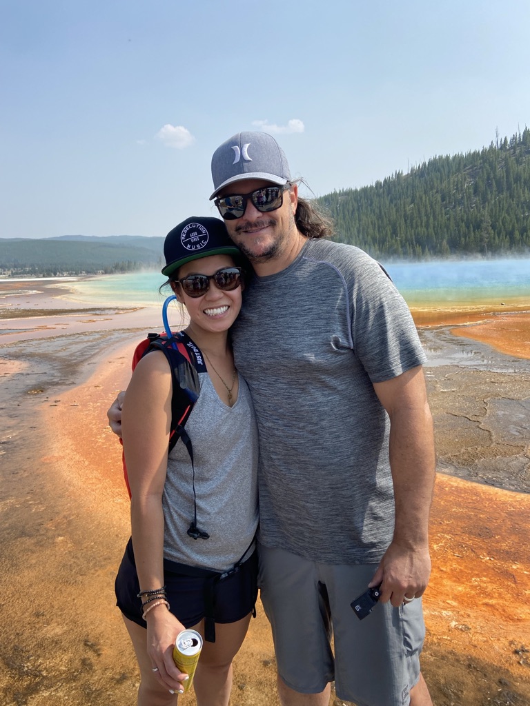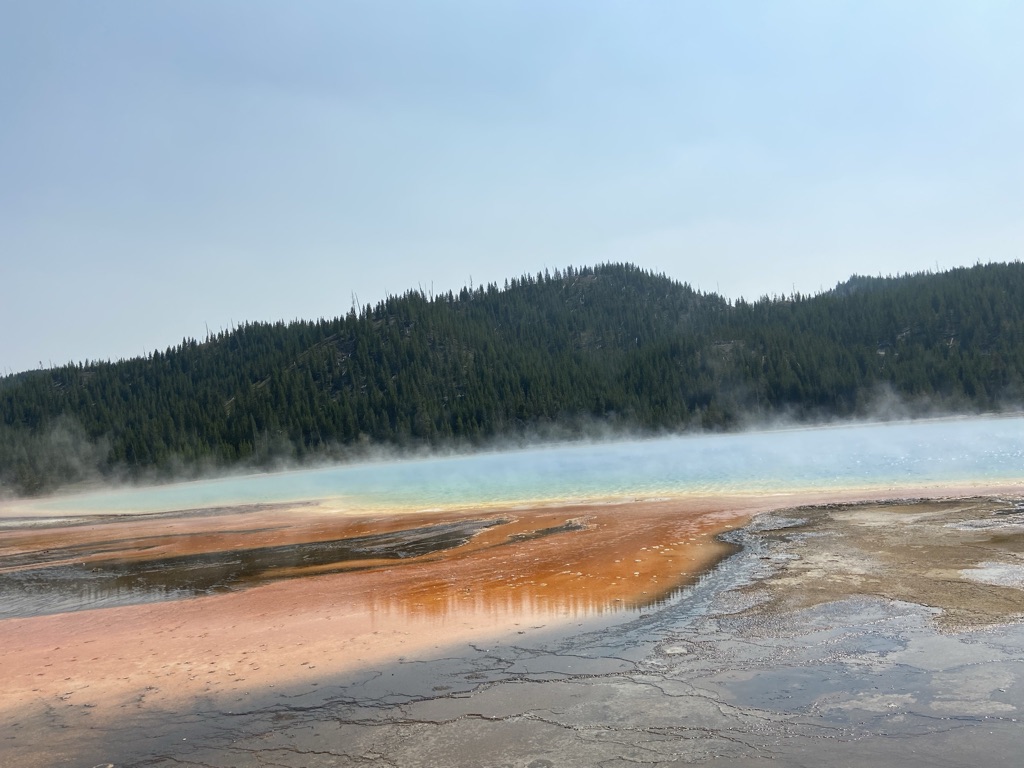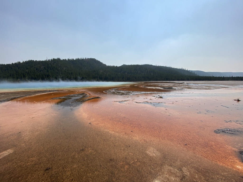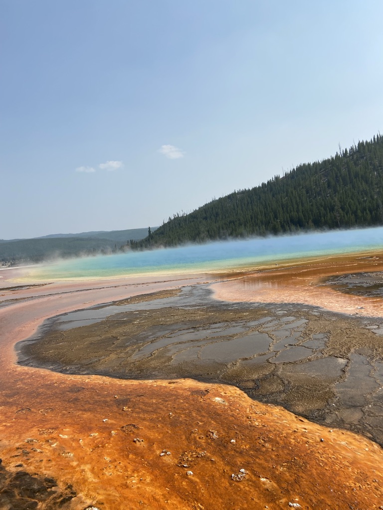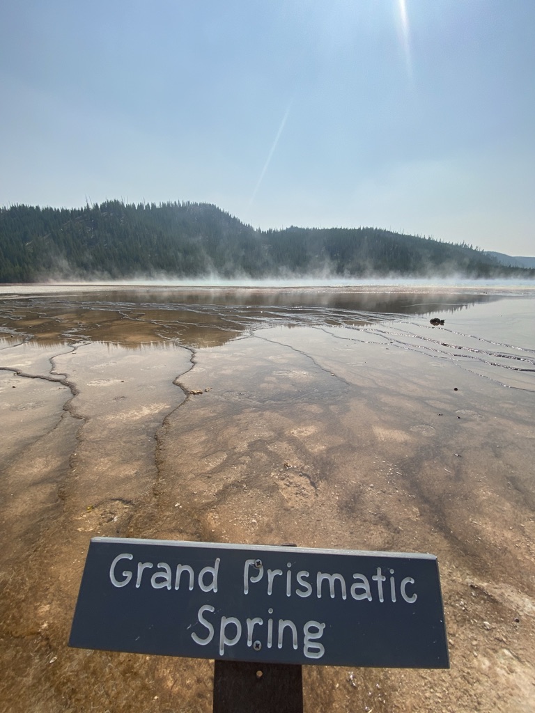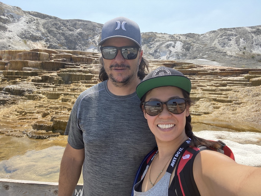 We headed towards Mammoth Hot Springs next. On the way there, we stopped at Wraith Falls, this was a super short hike to a somewhat disappointing waterfall, although I’m sure it has its better days in other times of the year. Once we got to Mammoth Hot Springs, we walked around the Lower Terrace before driving through the Upper Terrace and making our way back down towards the Grand Prismatic Spring! Last week when we came, we drove past this not realizing what a sight we were missing out on, so I wanted to make sure we made it a part of our plans this weekend and I am so glad we did! I had no idea the beauty that my eyes were about to see! This is a must see stop if you’re planning to visit Yellowstone.