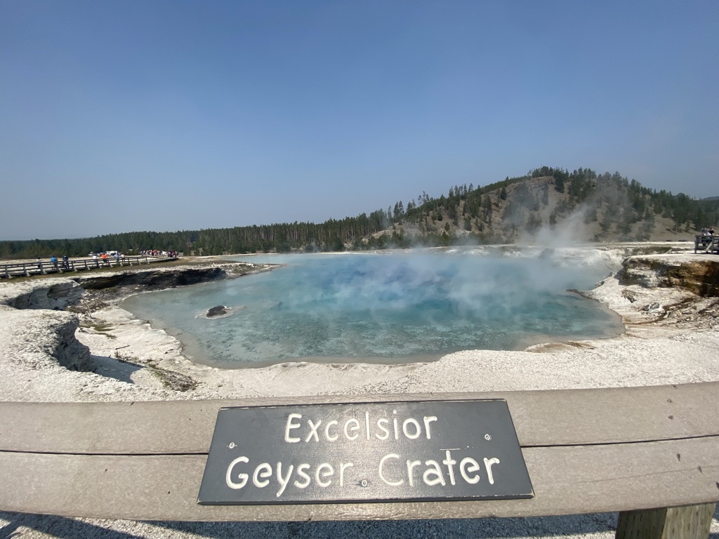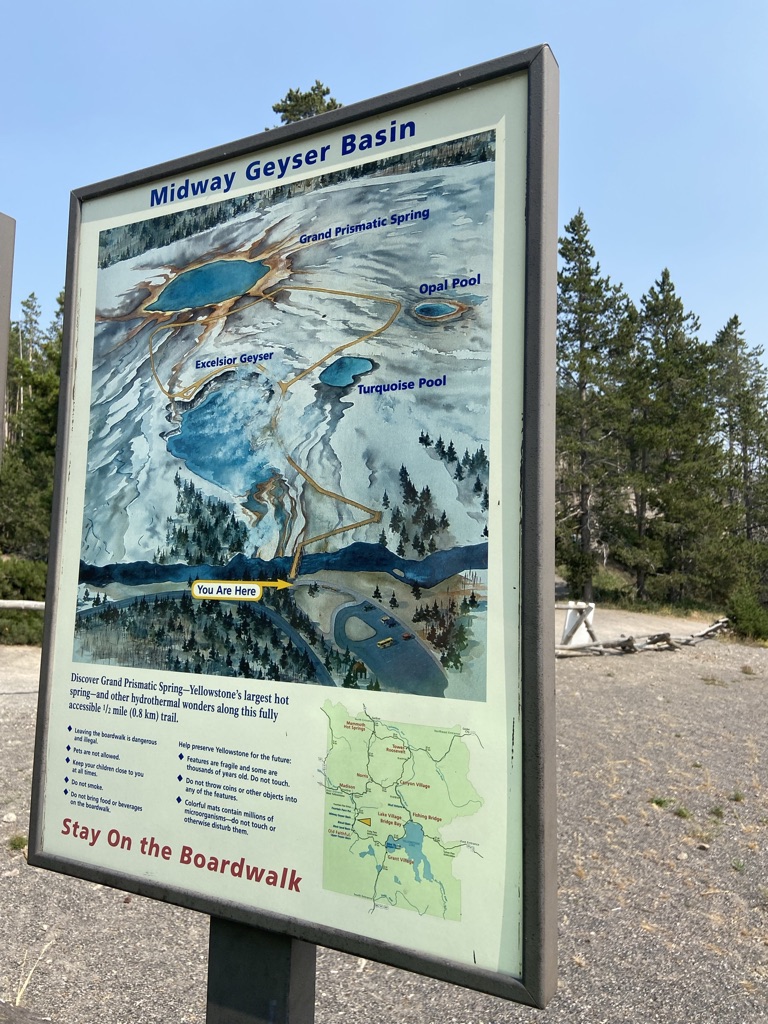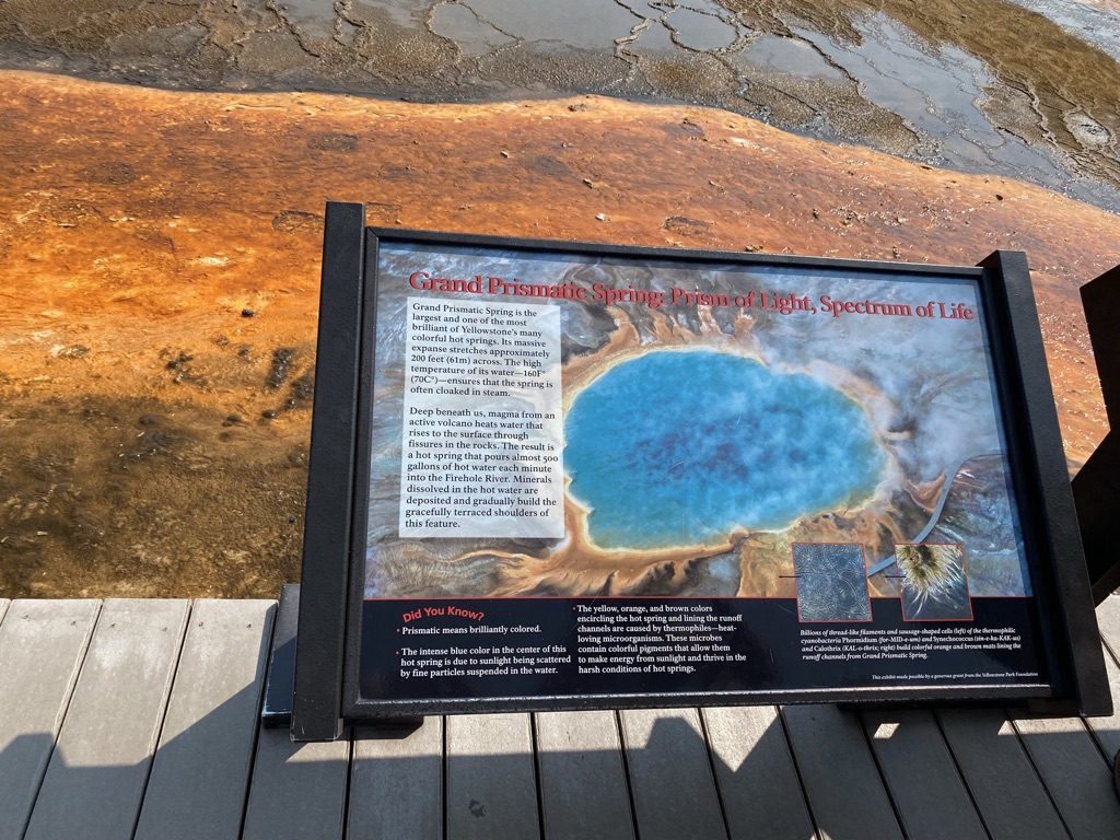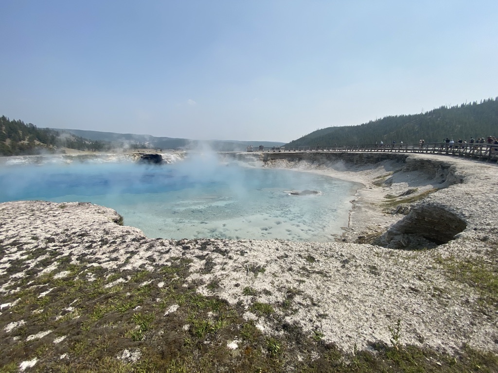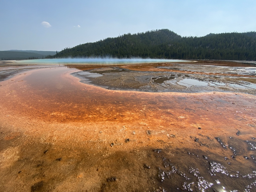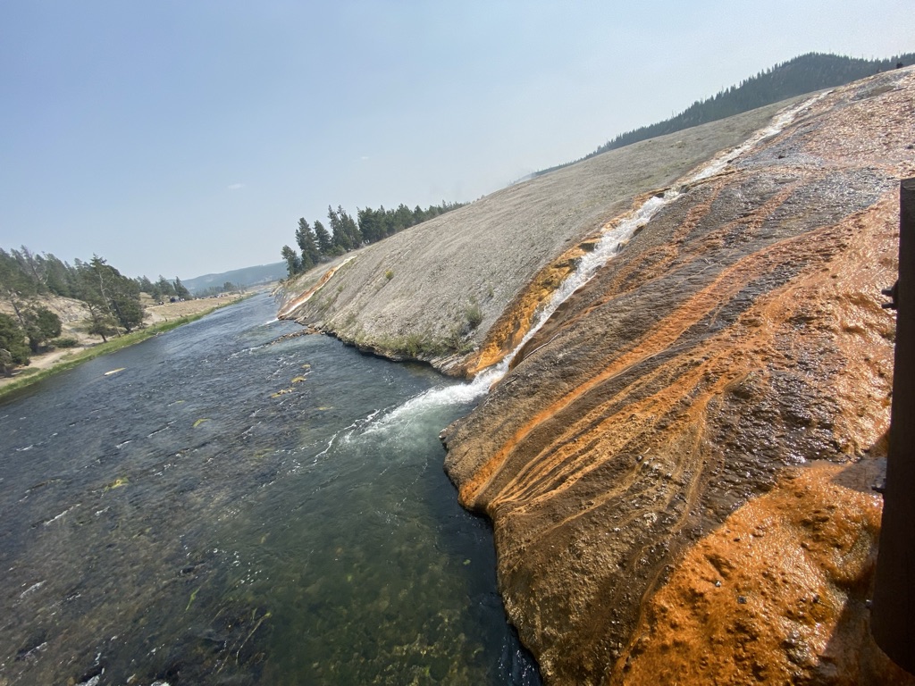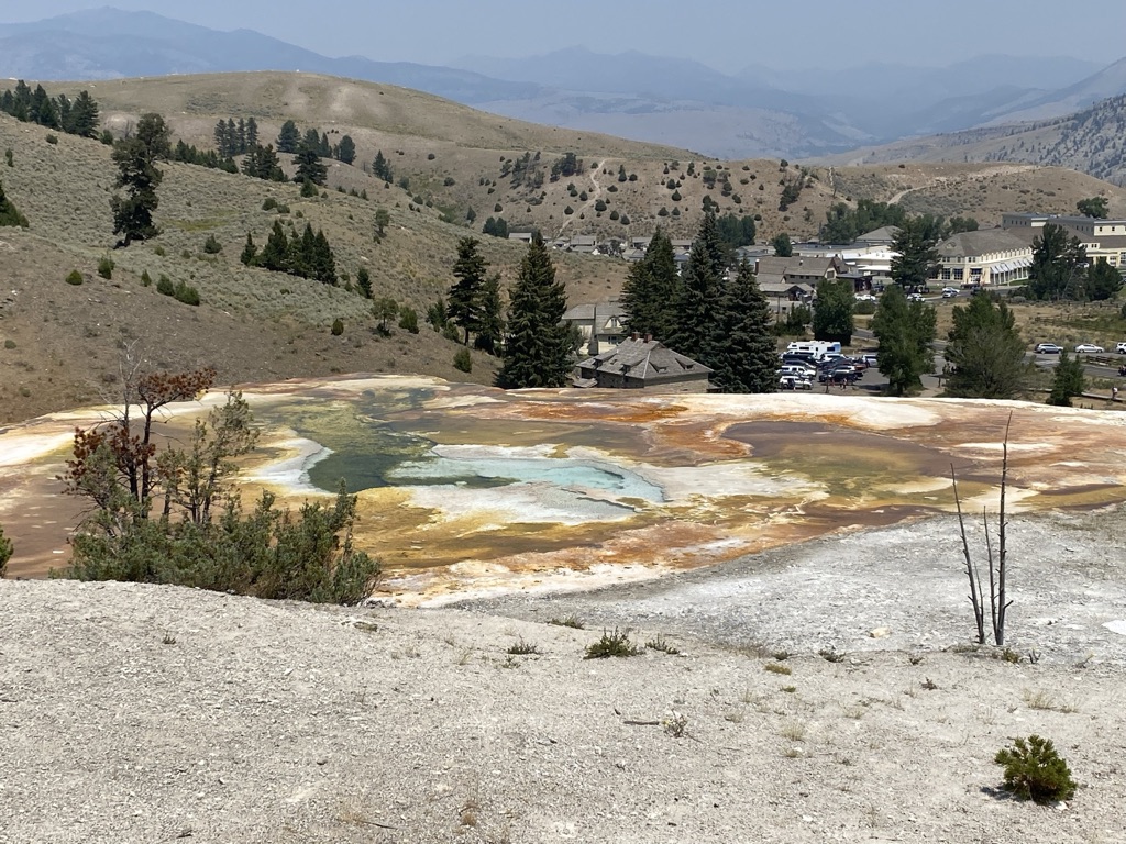 We headed towards Mammoth Hot Springs next. On the way there, we stopped at Wraith Falls, this was a super short hike to a somewhat disappointing waterfall, although I’m sure it has its better days in other times of the year. Once we got to Mammoth Hot Springs, we walked around the Lower Terrace before driving through the Upper Terrace and making our way back down towards the Grand Prismatic Spring! Last week when we came, we drove past this not realizing what a sight we were missing out on, so I wanted to make sure we made it a part of our plans this weekend and I am so glad we did! I had no idea the beauty that my eyes were about to see! This is a must see stop if you’re planning to visit Yellowstone.