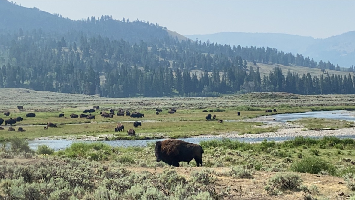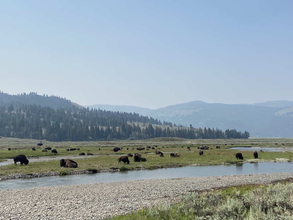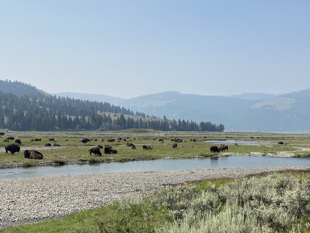 Coming in from the North-East entrance allowed for us to start in Lamar Valley early morning to see all the Buffalo! Definitely recommend this route! We saw so many herds, but we stopped at the very first herd we saw to get a closer look. They were all down by the river enjoying the beautiful morning. We were spoiled by one fun guy who put on a little show for us. He dropped down onto a dirt pile and rolled around while making some grunting sounds. I learned, they do this to coat themselves with dirt as a protective layer from flies and mosquitos. Such an awesome sight to see! I uploaded a video to our YouTube Channel for anyone who’d like to see! I could probably spend all day watching the Buffalo roam around and play. If wildlife is something you’re interested in seeing, go to the park early and go to Lamar Valley!